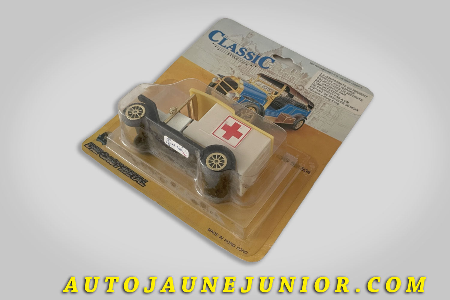 Roue en plastique noir avec insert en plastique doré. Ce modèle a été fabriqué à Hong Kong dans les années 90, sûrement dans un but d'exportation. D'ailleurs, un autocollant en français précise les normes européennes en vigueur à respecter concernant les jouets. Il semblerait que le fabricant est utilisé les mêmes moules que MatchboxCette Ford T dans sa version ambulance est ici présenté en superbe état, encore sous son blister, non déballé. Tout petit prix pour ce sympathique objet original, représentatif de toute une période ! Cette sympathique série comporte 4 modèles ! Nous vous proposons la série complète ici !